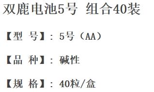 • 商品名稱:雙鹿堿性電池(5號,2節(jié)/組,20組/盒)按組售