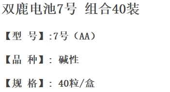 • 商品名稱:雙鹿堿性電池(7號,2節(jié)/組,20組/盒)按組售