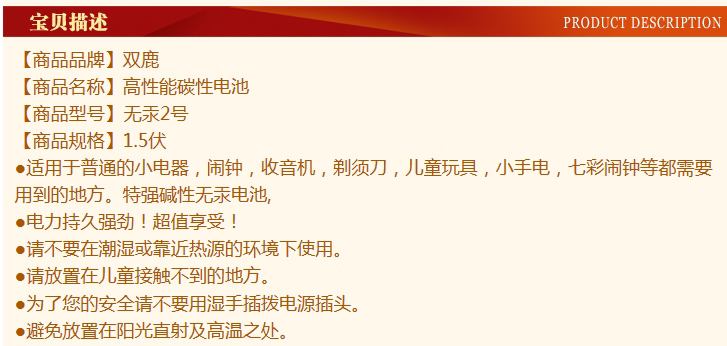 • 商品名稱:雙鹿高性能無(wú)汞碳性電池(2號(hào),2節(jié)/組,24節(jié)/盒)按組售