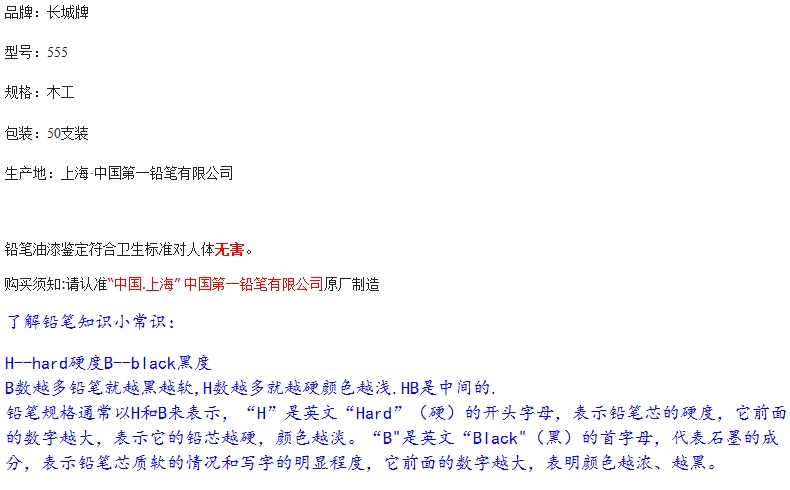 • 商品名稱:長城牌 555 木工鉛筆 (50支/包,250支/盒)按包售