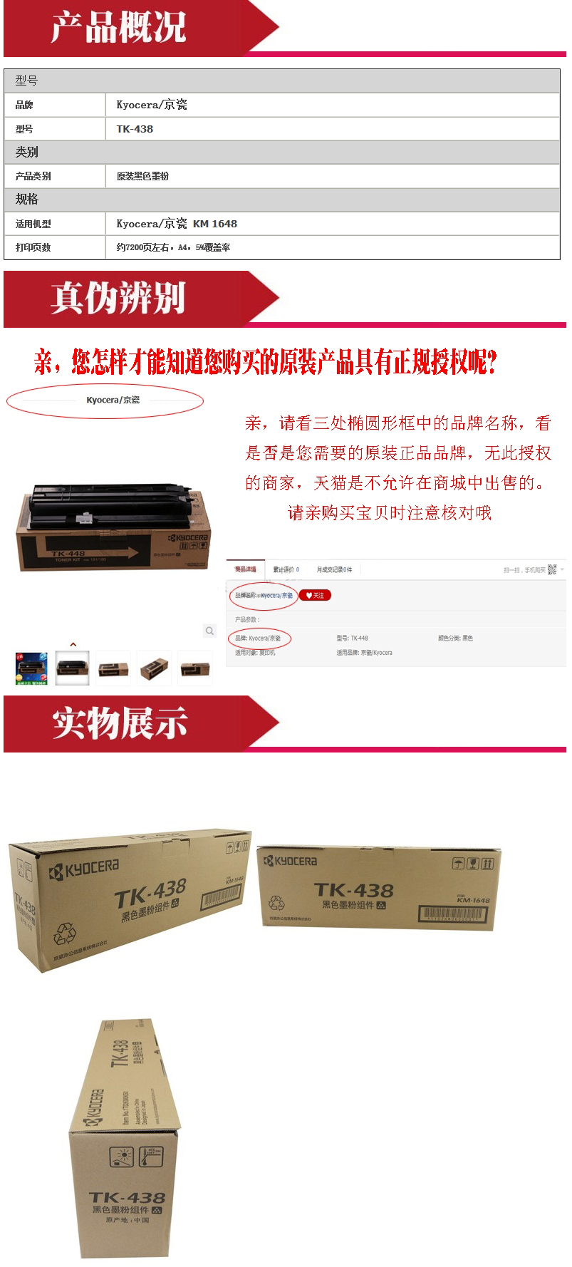 - 商品名稱:原裝京瓷(KYOCERA)TK-438復印機墨粉 KM1648
