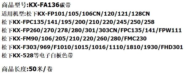 - 商品名稱:松下傳真機(jī)KX-FA136A碳帶(2卷/盒;按盒售)