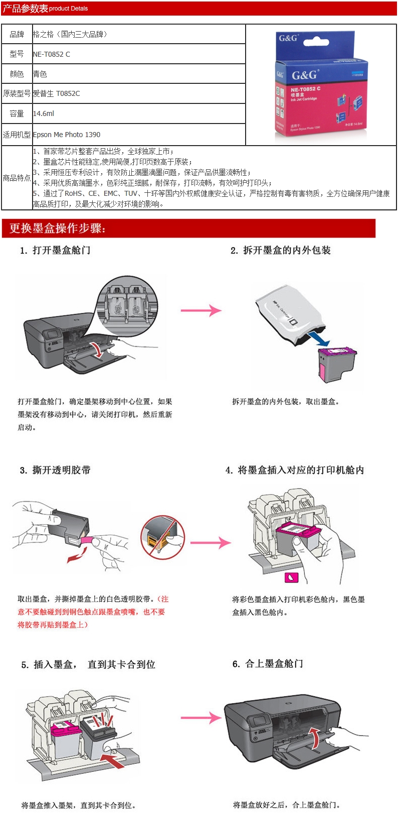 - 商品名稱:格之格愛普生 T0852 青色墨盒(適用1390/R330)