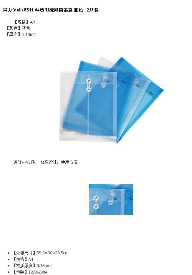 • 商品名稱:得力(deli) A4 繩扣式檔案袋 5511 (透明,12個/包)