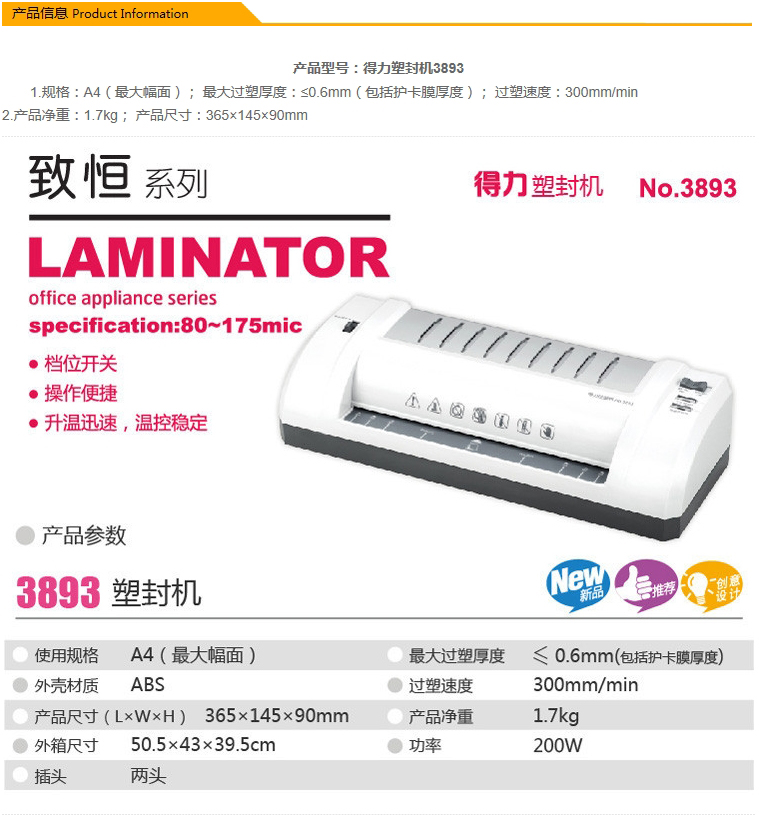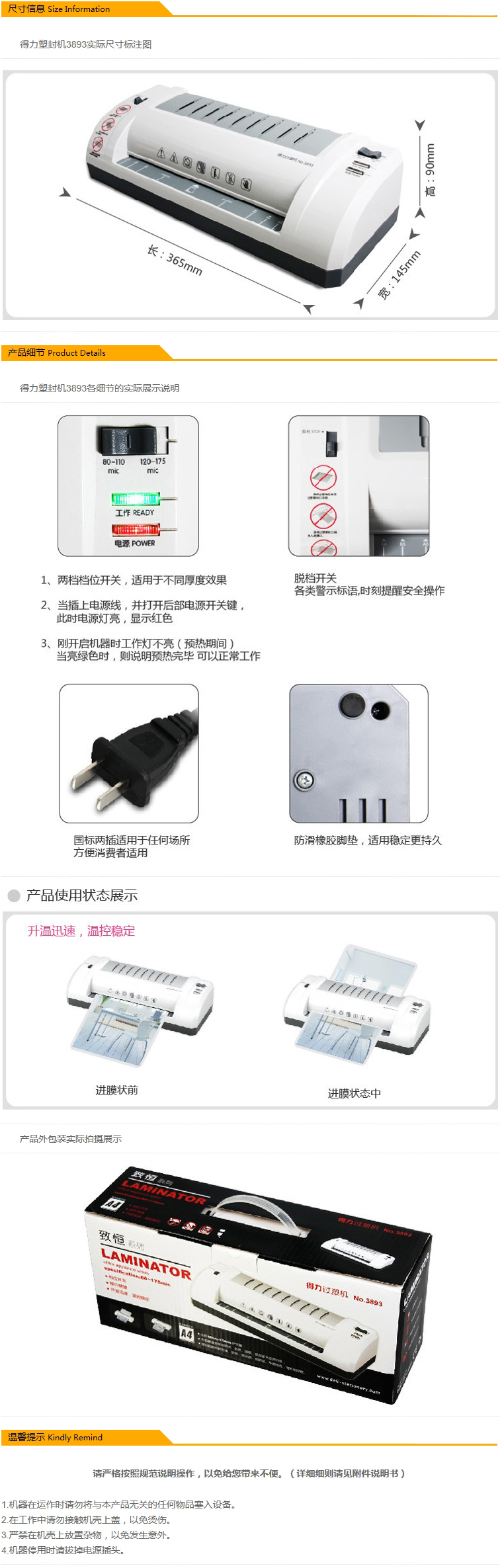 - 商品名稱:得力(Deli)3893 適用A4簡(jiǎn)潔時(shí)尚靜音型塑封機(jī)/過(guò)塑機(jī)