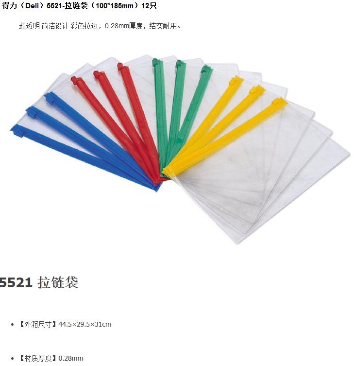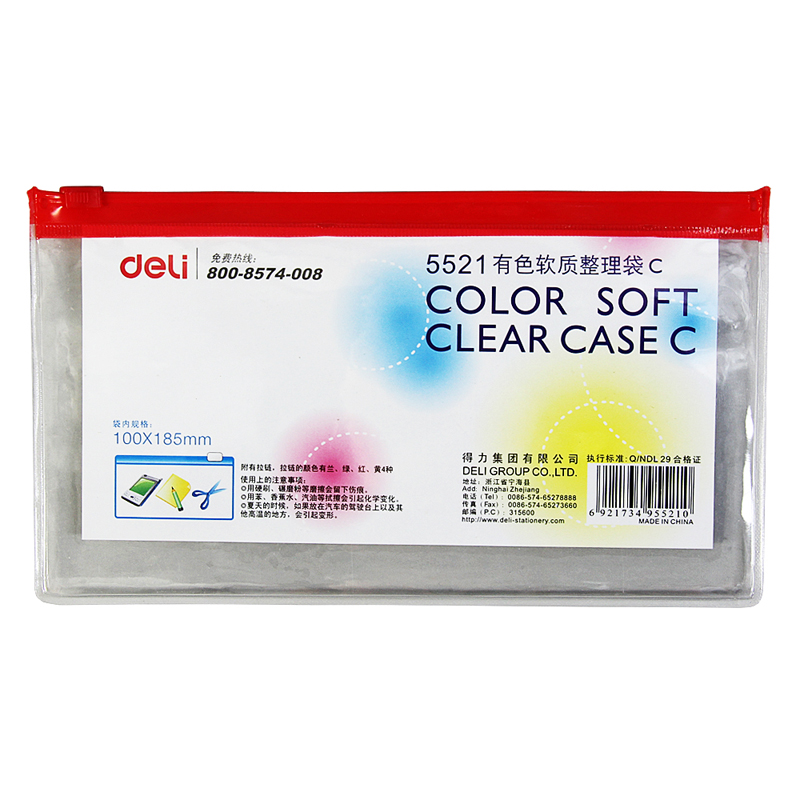• 商品名稱:得力(deli)透明加厚PVC票據(jù)拉鏈袋 5521(混色,100*185mm,12個(gè)/包)