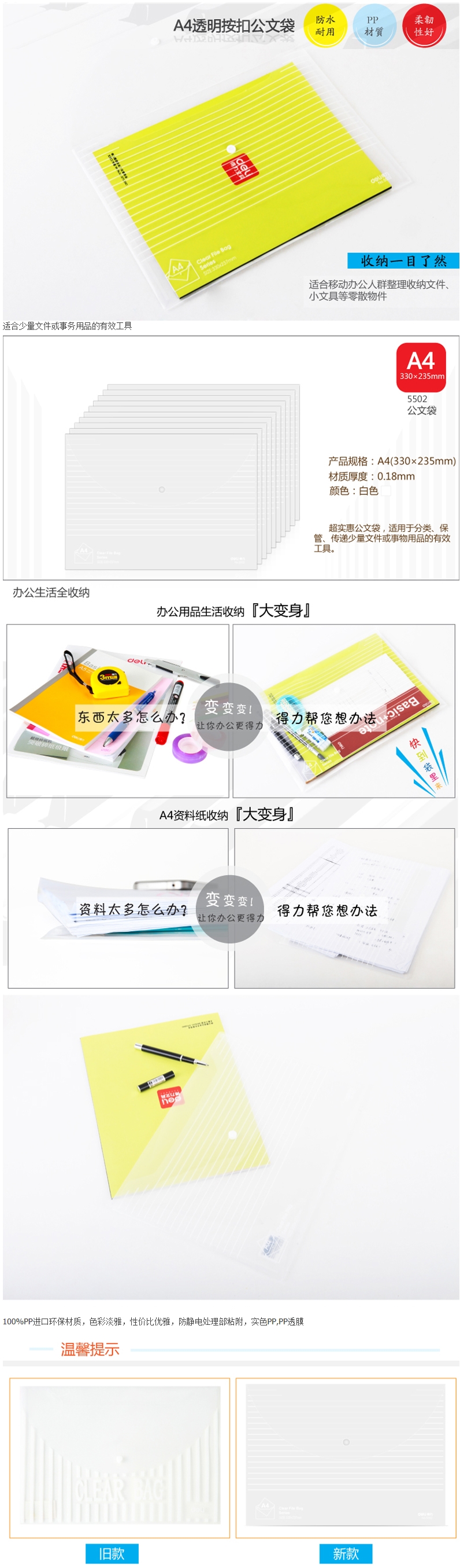 • 商品名稱:得力(deli)透明按扣文件袋 5502(混色,A4,10個/包)
