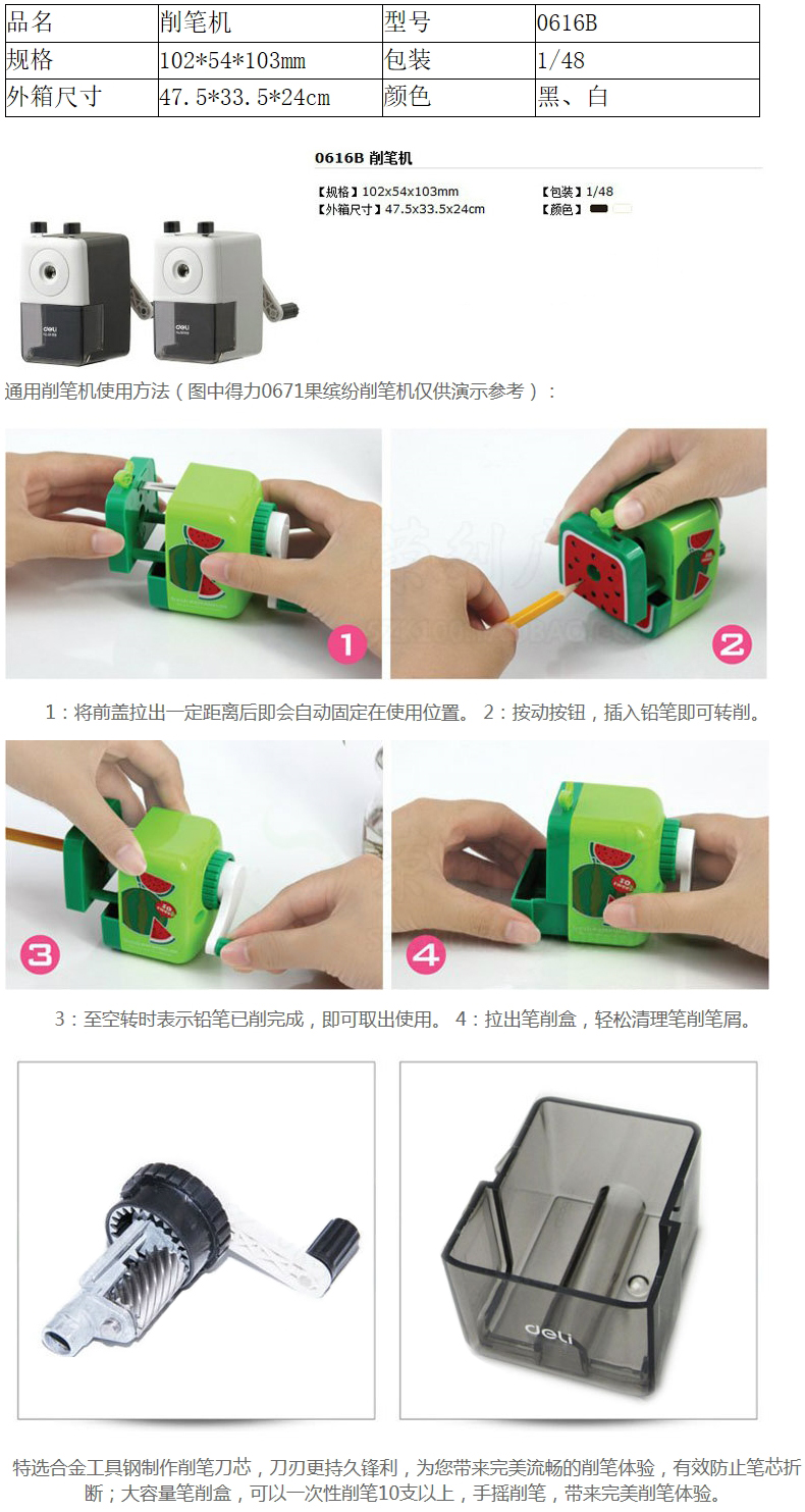 • 商品名稱(chēng):得力(deli)0616B 削筆機(jī)(102*54*103mm)