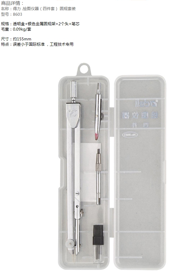 • 商品名稱:得力(deli)繪圖儀器/圓規(guī) 8603(四件套,10套/盒)