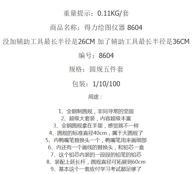 • 商品名稱:得力(deli)繪圖儀器/圓規(guī) 8604(五件套,10套/盒)
