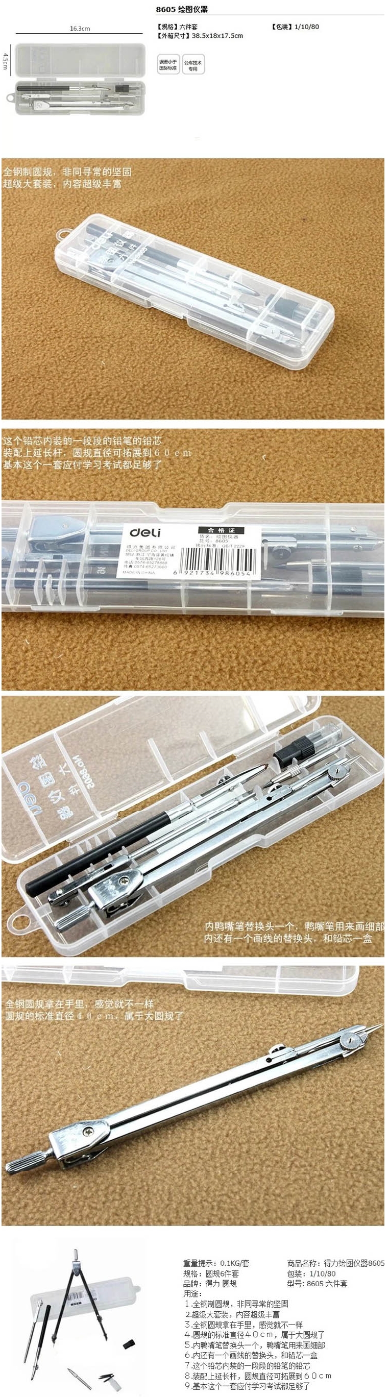 • 商品名稱:得力(deli)繪圖儀器/圓規(guī) 8605(六件套,10套/盒)