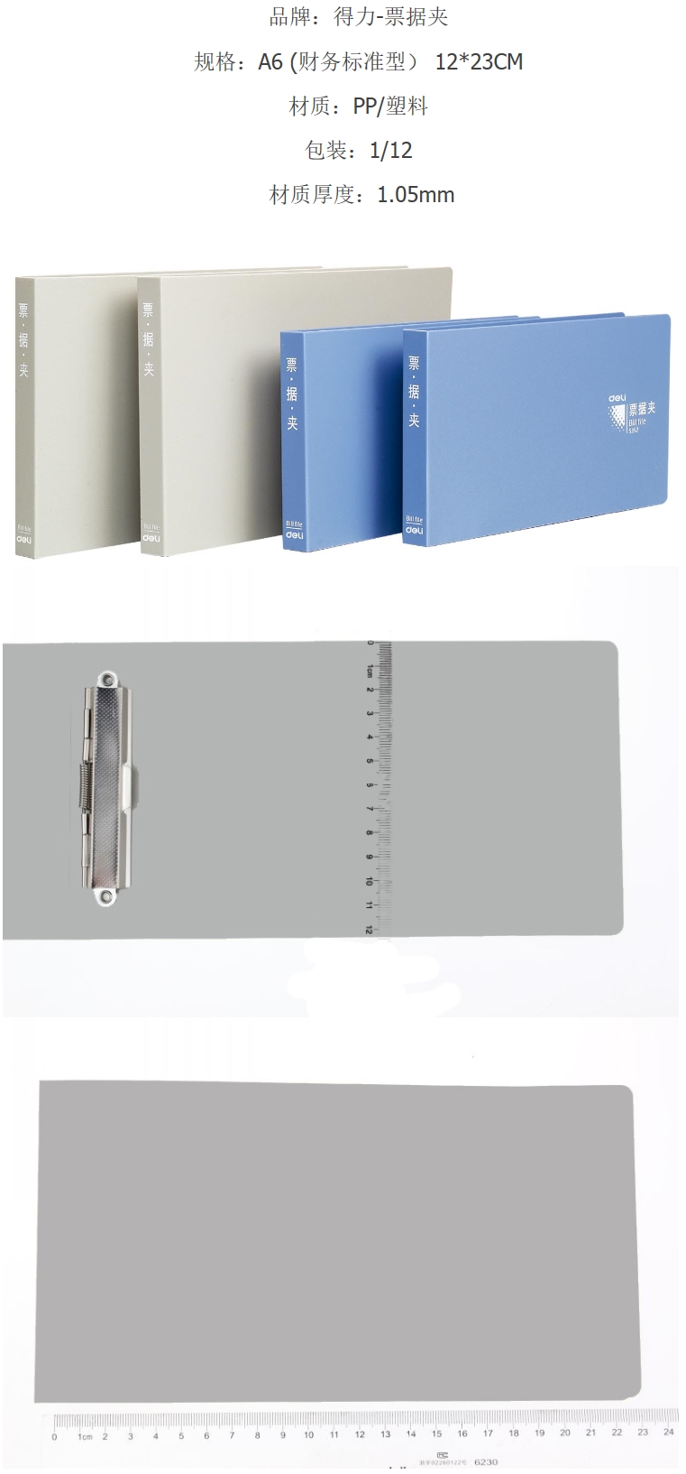 • 商品名稱:得力(deli) 5352票據(jù)夾(規(guī)格:231*124*18mm;36只/盒)