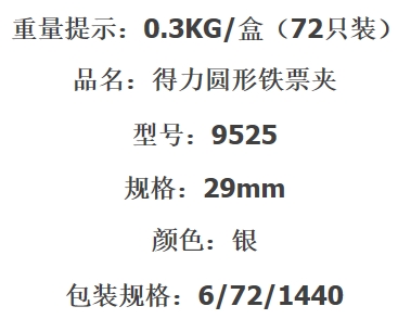 - 商品名稱:得力(deli)不銹鋼圓型票夾 29mm 5# 9525(6只/打,72只/盒)按打售