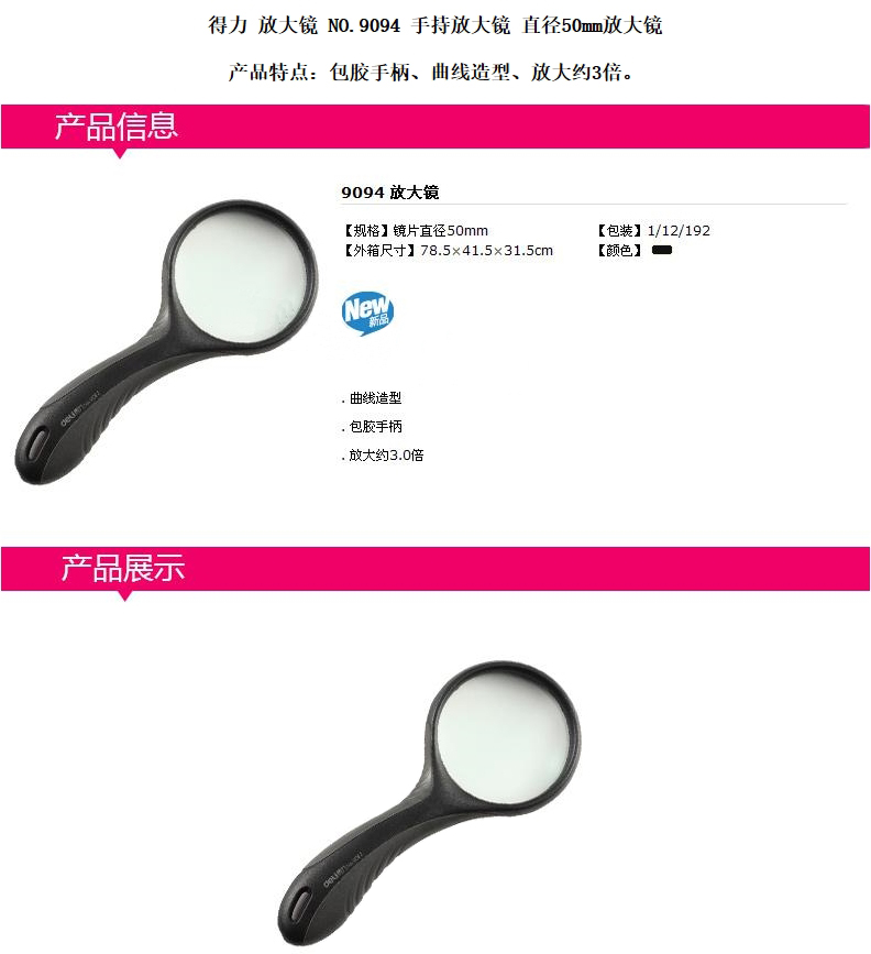 - 商品名稱:得力(deli)9094放大鏡(規(guī)格:鏡片直徑50mm;約放大3.0倍)