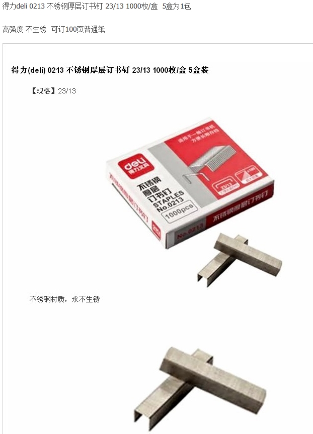 • 商品名稱(chēng):得力(deli) 0213 厚層不銹鋼訂書(shū)針 23/13 (1000支/盒,5盒/封)