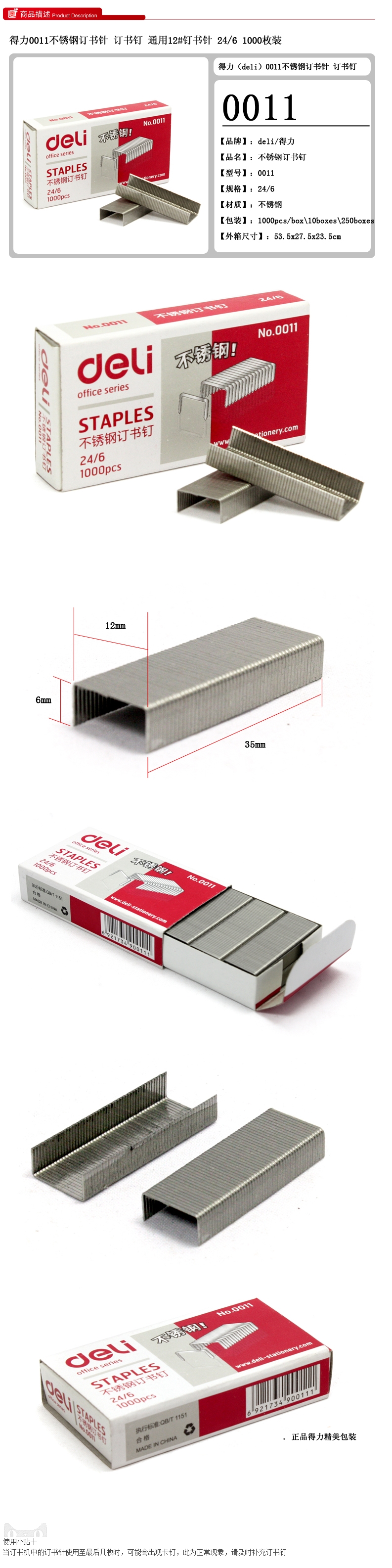 • 商品名稱:得力(deli) 0011 不銹鋼訂書針 24/6 (1000支/盒,10盒/條)