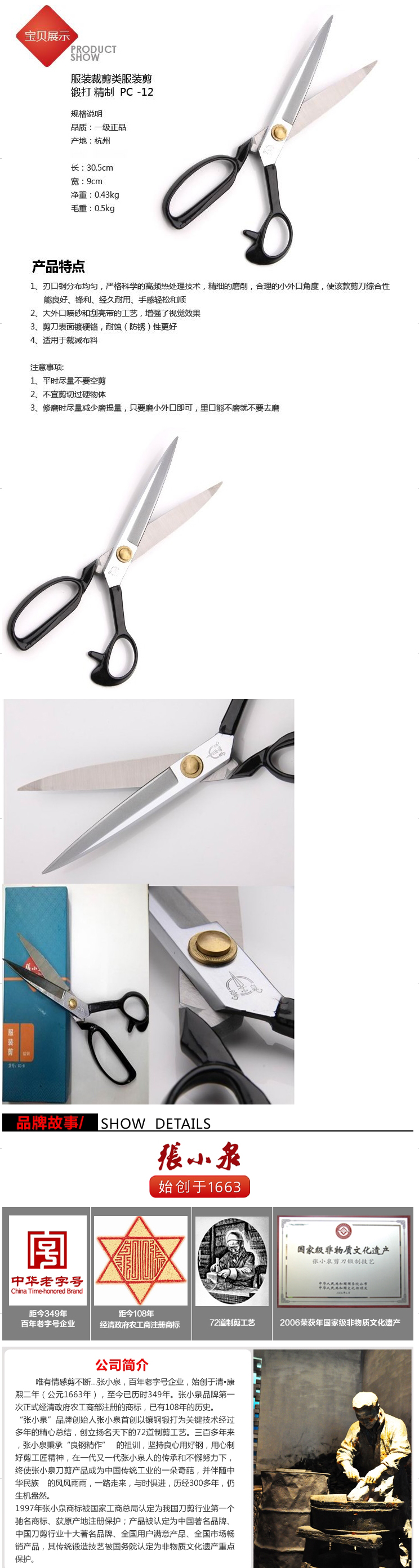 • 商品名稱:張小泉服裝剪刀 PC-12寸(6把/盒)