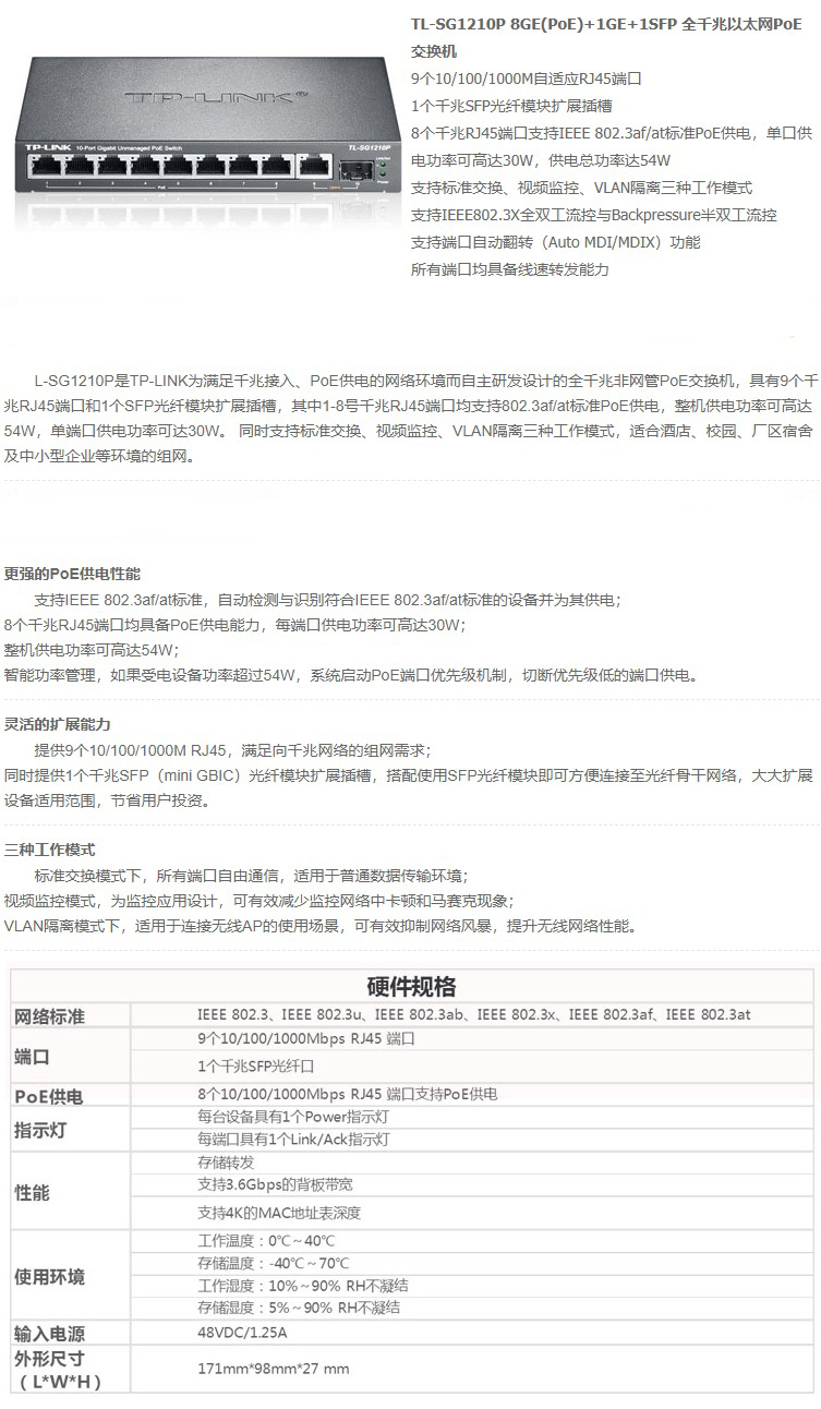 - 商品名稱:TP-LINK SG1210P 8口千兆POE交換機(jī) 1千兆口+1千兆光纖口