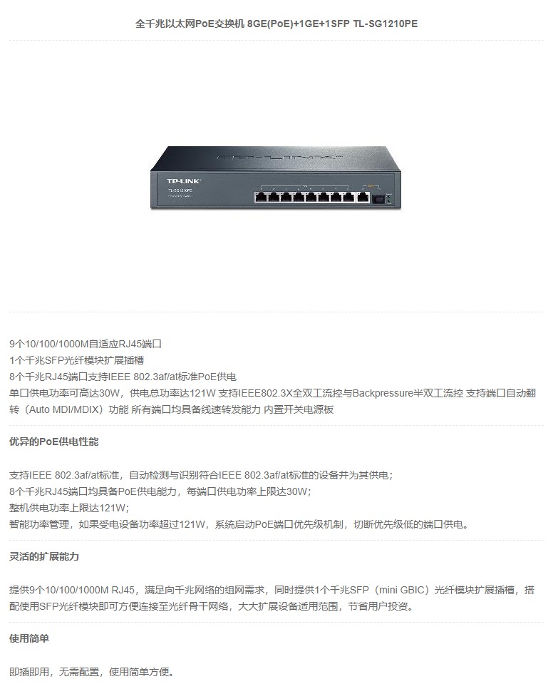 - 商品名稱:P-LINK TL-SG1210PE 8口千兆POE交換機(jī)(1千兆口+1千兆光纖口)