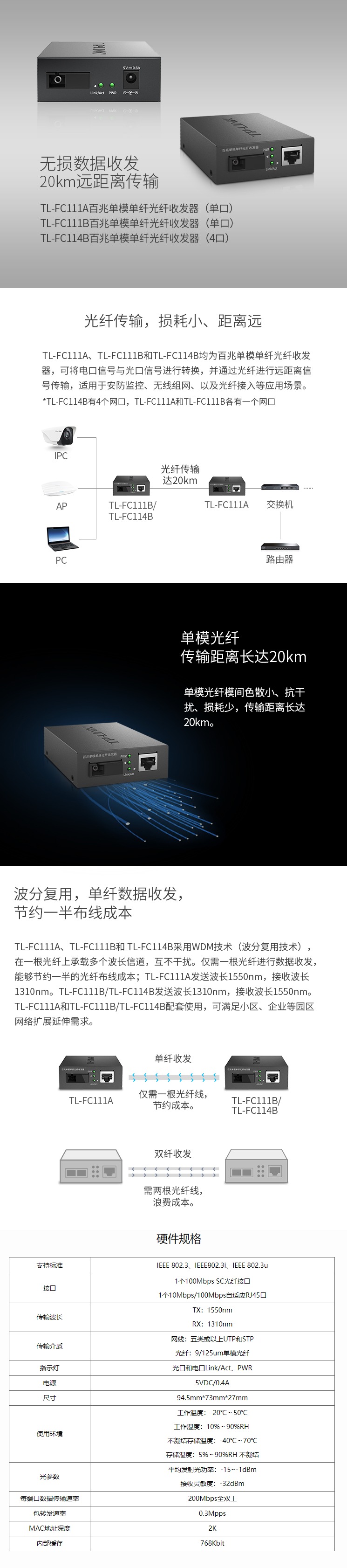 - 商品名稱:TP-LINK TL-FC111A 百兆單模單纖光纖收發(fā)器 光電轉(zhuǎn)換器(單只裝)