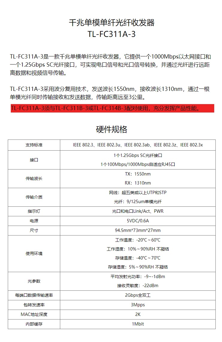 - 商品名稱:TP-LINK TL-FC311A-3 千兆單模單纖光纖收發(fā)器 光電轉(zhuǎn)換器(單只裝)