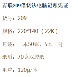 • 商品名稱:青聯(lián)借貸法電腦記賬憑證 209(22開,50張/本,10本/封)