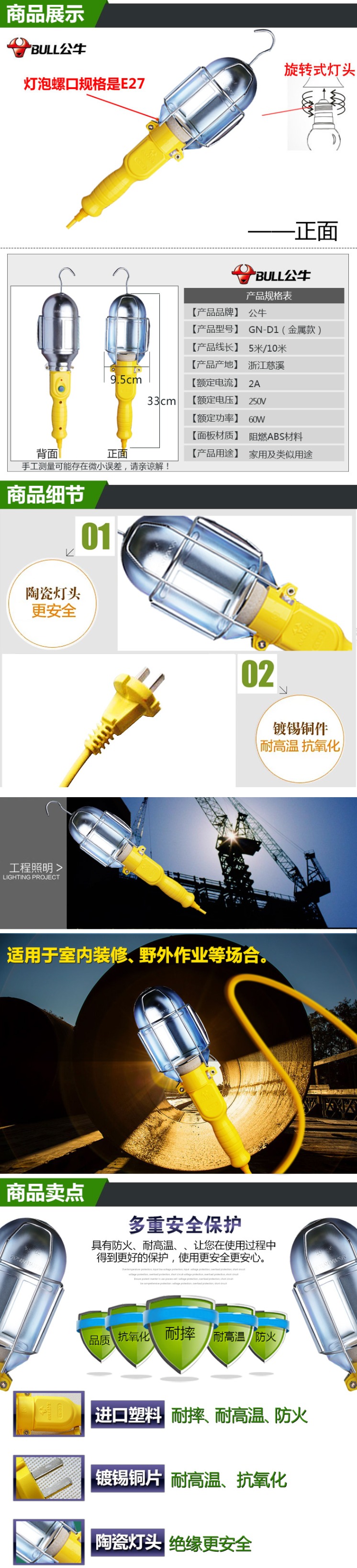 - 商品名稱:公牛 工作燈GN-D1 60W 5米汽車照明檢修移動手持維修汽修燈(不含燈泡)