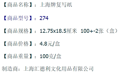- 商品名稱:上海復(fù)寫紙藍(lán)色 32K 274(12.75*18.5cm,100張/盒)