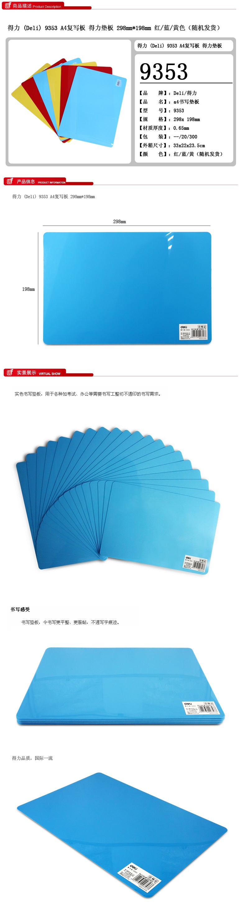 • 商品名稱:得力(deli)復(fù)寫板 A4 9353(298*198mm,20塊/包)
