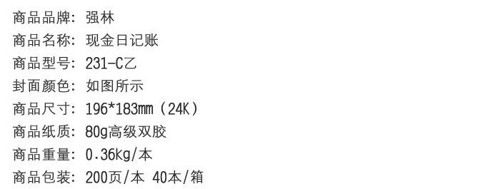 • 商品名稱:強林現(xiàn)金日記賬 231-C乙彩面(24開,200頁/本)