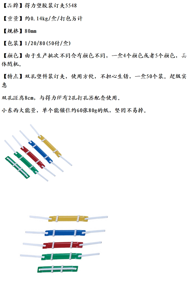 • 商品名稱:得力(deli)塑料裝訂夾條 5548(50付/盒,20盒/大盒)按盒售