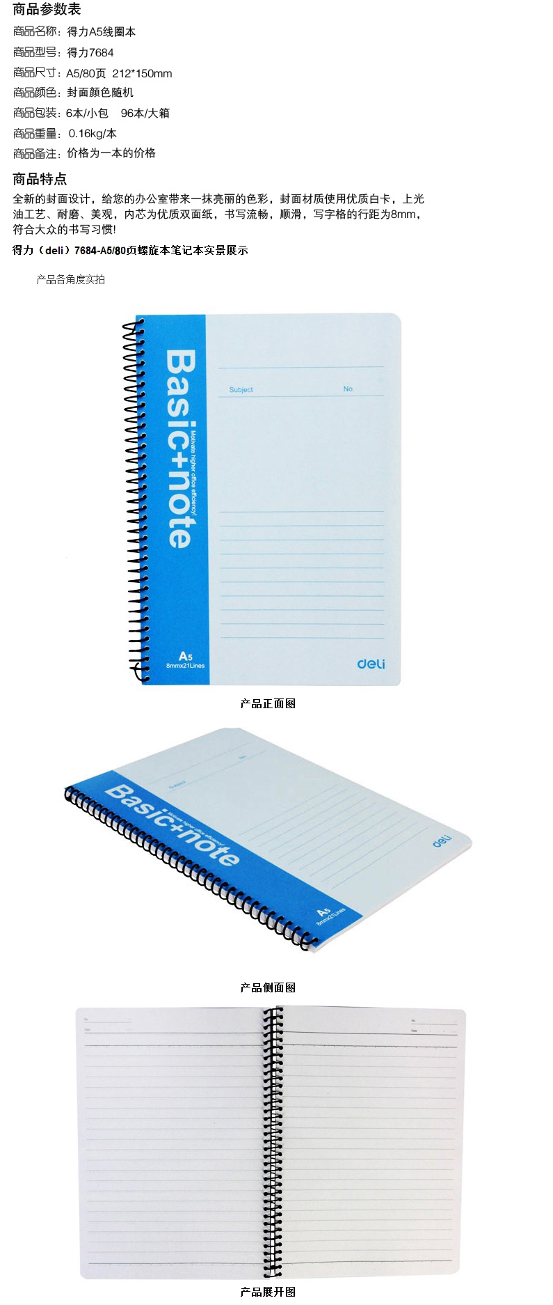 - 商品名稱:得力(deli)螺旋筆記本 80頁 A5 7684