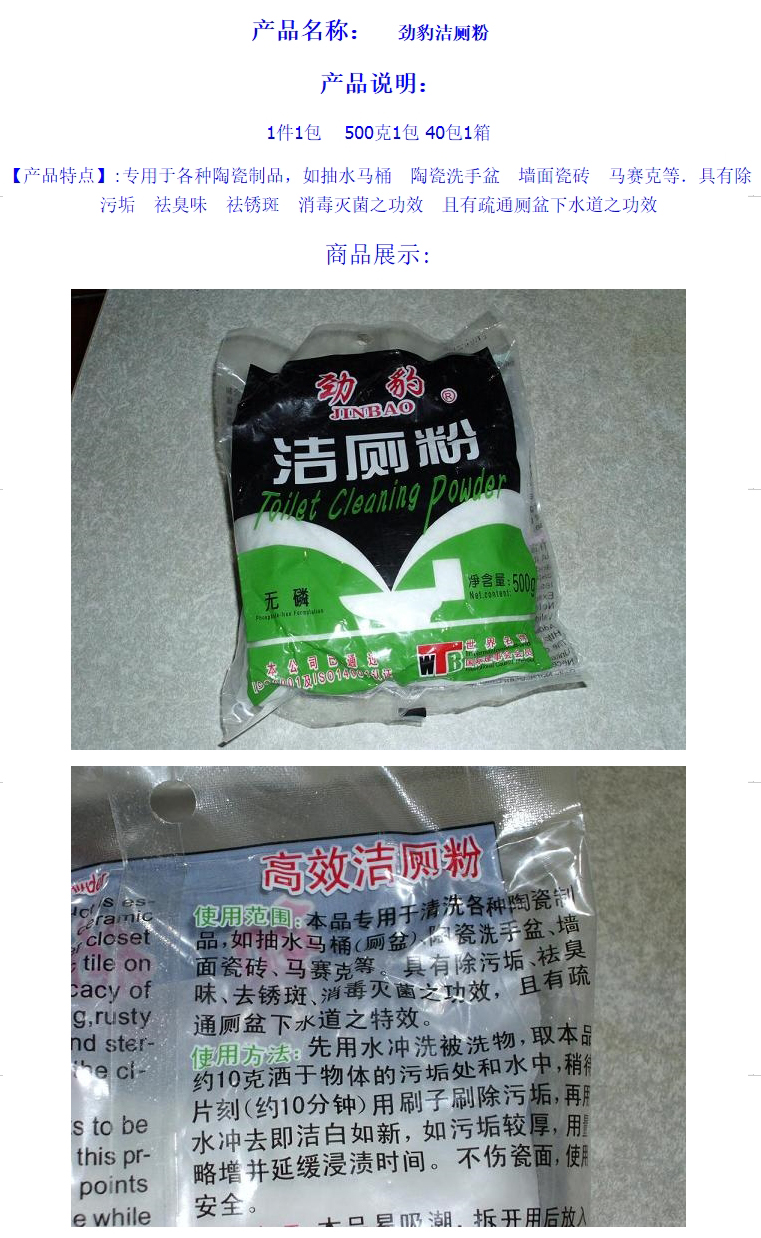 • 商品名稱:勁豹高效潔廁粉 袋裝(500g/袋,40袋/箱)