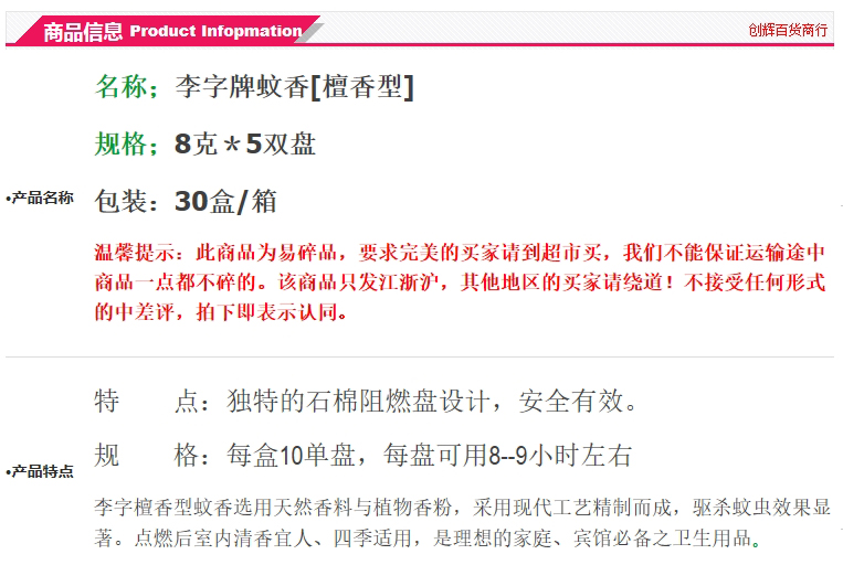 • 商品名稱:李字牌蚊香 檀香型(5雙圈裝;8g*5雙圈;30盒/箱)