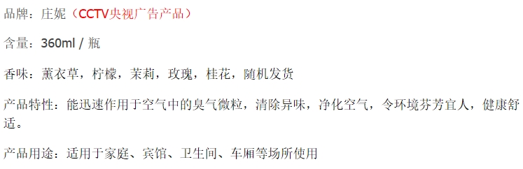• 商品名稱:莊妮空氣清新劑(360ml/瓶,24瓶/箱)
